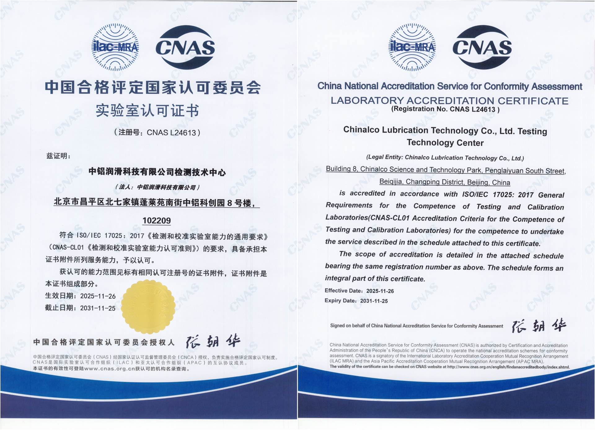 近日,中铝润滑科技有限公司检测技术中心通过中国合格评定国家认可委员会严格评审,获得国家级实验室认可证书,证书注册号CNAS L24613,有效期2025 年 11 月 26 日至 2031 年 11 月 25 日。这标志着中铝润滑技术管理水平与实验检测能力已达到国家及国际标准化体系要求,其出具的检测报告将获得全球数十个互认国家的承认,在公信力与权威性上迈上了全新台阶。